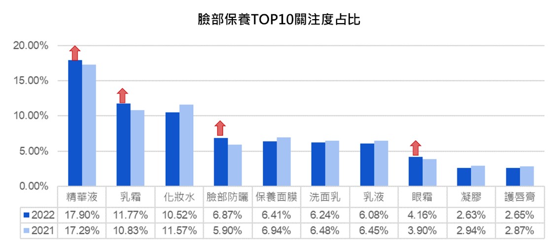 臉部保養在2022和2021兩個年度區間比較下,2022年度下半年消費者對臉部保養關注占比普遍下降,但其實臉部保養的關注並未下降,主要是因為臉部彩妝的關注明顯回升連帶影響其餘屬性的占比。在臉部保養分類中,消費者關注占比TOP10 (如下圖3),最高的仍是精華液,其次是乳霜以及化妝水,再來是臉部防曬與保養面膜。TOP10的屬性關注度呈現成長的為精華液、乳霜、臉部防曬、眼霜,其中精華液及乳霜不僅關注度高且近年度關注更持續成長,而臉部防曬的關注成長幅度最為明顯。