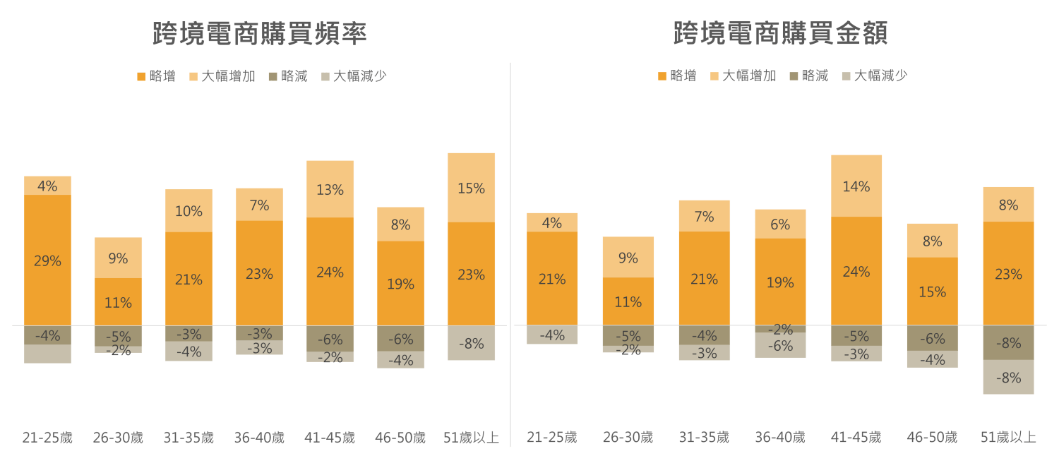 跨境電商展現強勁成長動能,總體使用比例從15%上升至20%,成為本次調查中成長幅度最高的通路。所有年齡層的購買頻率和花費都顯著增加,證明這是不可逆的全球化消費趨勢。41-45歲的族群在購買頻率與購買花費的比例上領先,顯示他們對跨境購物的接受度高,且願意投入更多預算。
