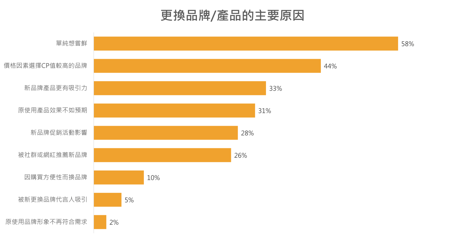 調查顯示,高達77%受訪者表示今年更換過原使用產品。更換品牌的主要原因依序為:想嘗試新品牌(58%)、價格考量(44%)、新品牌產品吸引力(33%)。這顯示消費者對品牌選擇較為開放,重視性價比與產品創新。