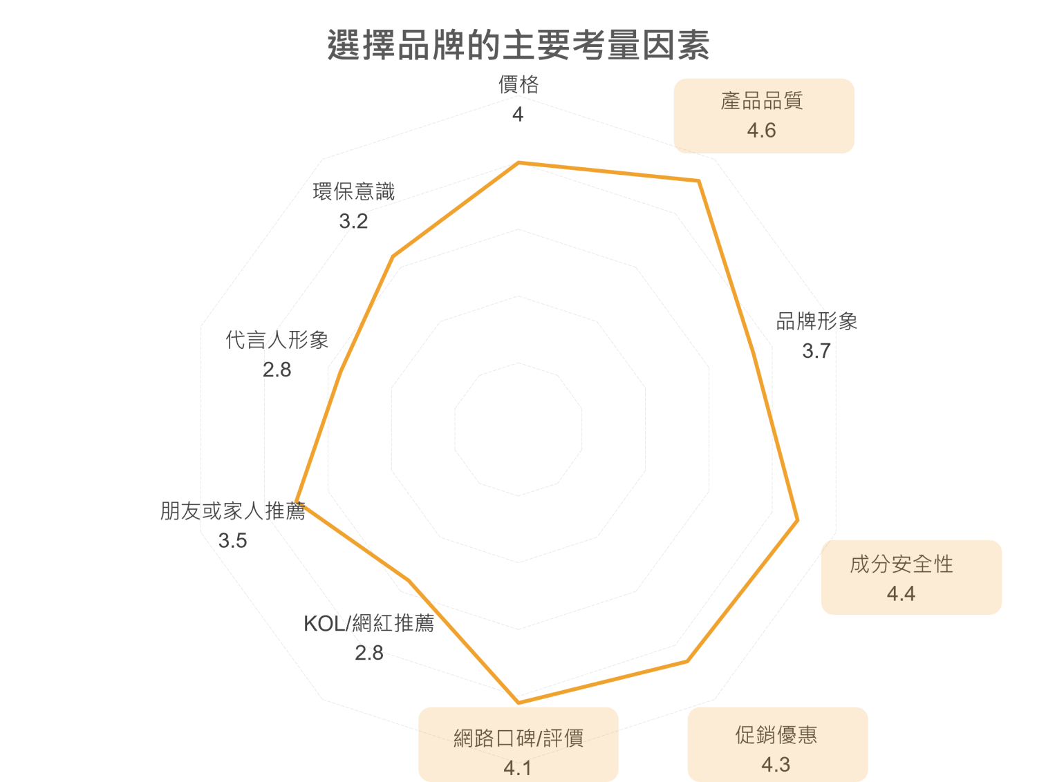 在品牌選擇因素方面,產品品質(4.6)與成分安全性(4.4)是最重要的考量,其次是促銷優惠(4.3)與價格(4.0)。網路口碑/評價(4.1)的影響力明顯高於傳統的朋友/家人推薦(3.5)與代言人或KOL推薦(2.8),顯示消費者更依賴線上評價與真實使用心得。
