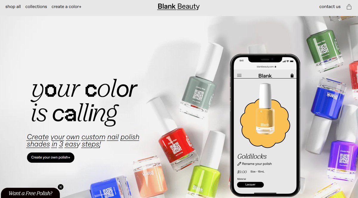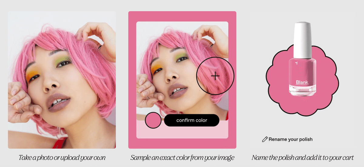 另一方面,Dolly 是透過官方網站接受來自網路的訂單,製作並寄送依使用者喜好顏色客製化的指甲油。與 Huey 相比,Dolly 更重視大量生產的效率,色彩變化約有 4 萬種,目前在美國田納西州諾克斯維爾的 Blank Beauty 總部設置製造場地。