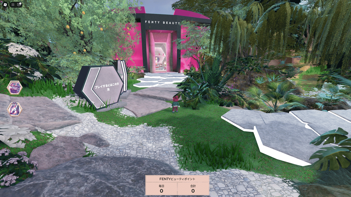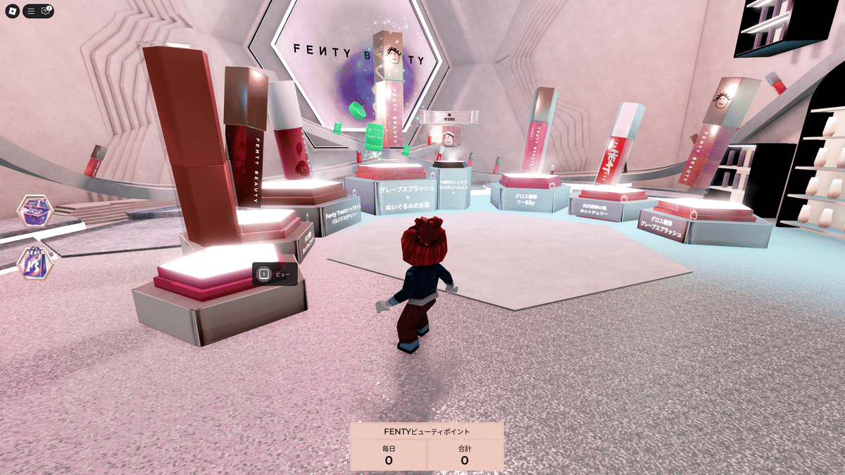 Fenty Beauty 的世界有兩個區域,一個可以參加獲得限定數位物品的任務,另一個則展示該品牌販售的唇膏等商品的 3D 模型。靠近商品時可以選取,會出現詳細說明畫面。部分商品還可以觀看影片。如果你住在可購買的地區,就能直接進入購買頁面。