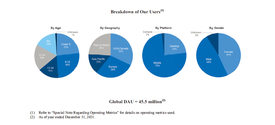 根據 Roblox 官方年報「Roblox 2024 Annual Report」,2024 年的每日活躍用戶(DAU)年齡構成為:13~16 歲佔 16%、17~24 歲佔 25%、25 歲以上佔 19%,近六成的用戶年齡在 13 歲以上。相比 2021 年報告中 13 歲以下用戶約佔一半的情況,可見在數年間用戶年齡層有所上升。