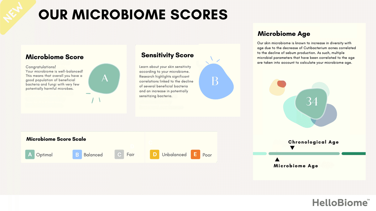 目前,HelloBiome 提供三種分數:「微生物群系分數」、「肌膚敏感度」和「微生物群系年齡」。這些分數均根據統計分佈和學術證據設計,即使是沒有專業知識的使用者或企業負責人,也能直觀地了解微生物群系的狀況。
