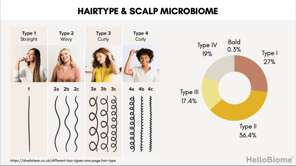 這項研究發現,如圖所示,不同髮質(從左到右依序為直髮、波浪髮、捲髮、螺旋捲髮)會導致頭皮和髮幹環境的差異,進而影響微生物體和真菌的組成、行為,甚至對某些產品的反應。這對於護髮產品的研發來說是一個新的發現,例如可以開發不僅針對髮質,也針對微生物體的產品。