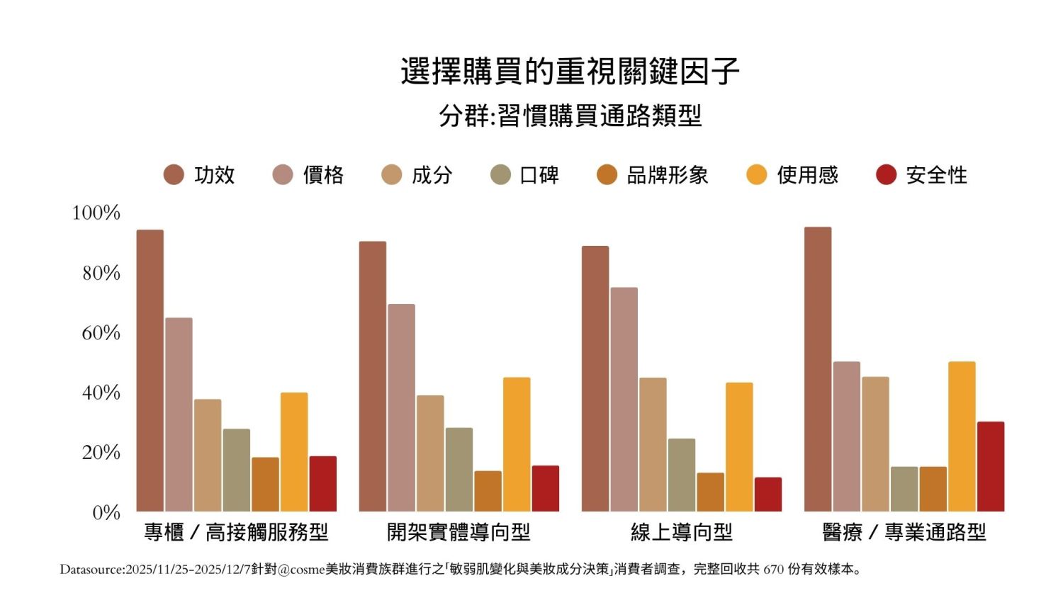 同時,通路差異也值得做內容與投放分工:通常選擇透過線上通路購買導向的消費者在價格敏感、對成分的關注相對更高;而選擇醫療/專業通路族群更重視功效與舒適度,且安全性的重要性更突出。這意味著「同一產品」在不同通路需要不同的說服證據:線上要強化透明與可比較,專業通路要強化安全與可追溯。