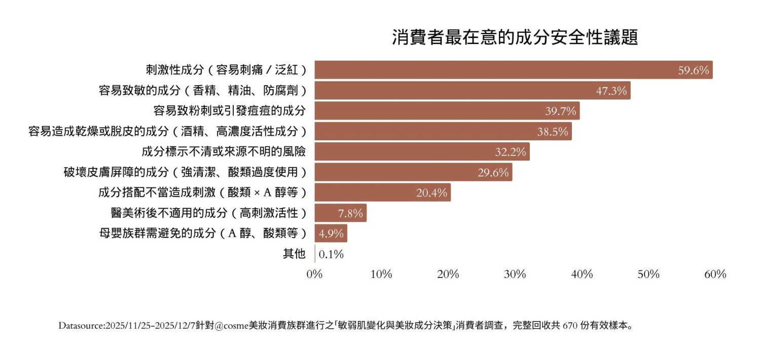 (第四階段)風險評估:最敏感的是“立即不適”,其次是“長期傷害” 消費者最在意的安全性議題集中在「立即感」:刺激性成分(59.6%)、容易致敏成分(47.3%)。其次才是粉刺痘痘(39.7%)與乾燥脫皮(38.5%),以及成分標示不清或來源不明(32.2%)、破壞屏障的成分(29.6%)、搭配不當造成刺激(20.4%)。