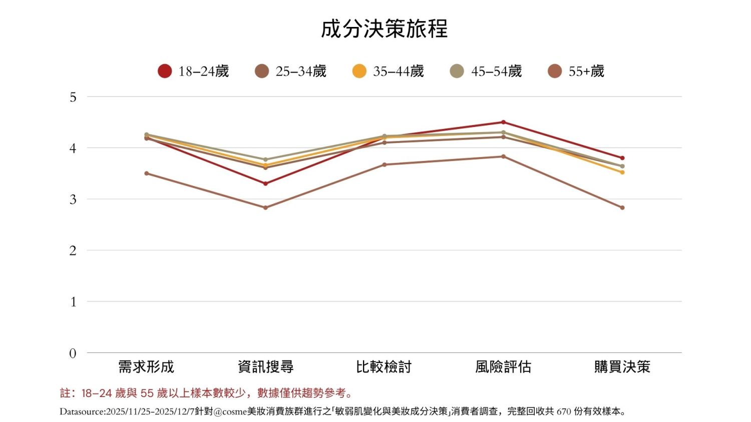 敏弱相關族群在購買決策歷程中,對成分的重視程度明顯高於其他族群,且對成分透明化特別敏感。同時,該族群對修護型成分的接受度高,包含 PDRN、外泌體、神經醯胺等,顯示市場對「穩定與修護」解決方案的需求持續成長。