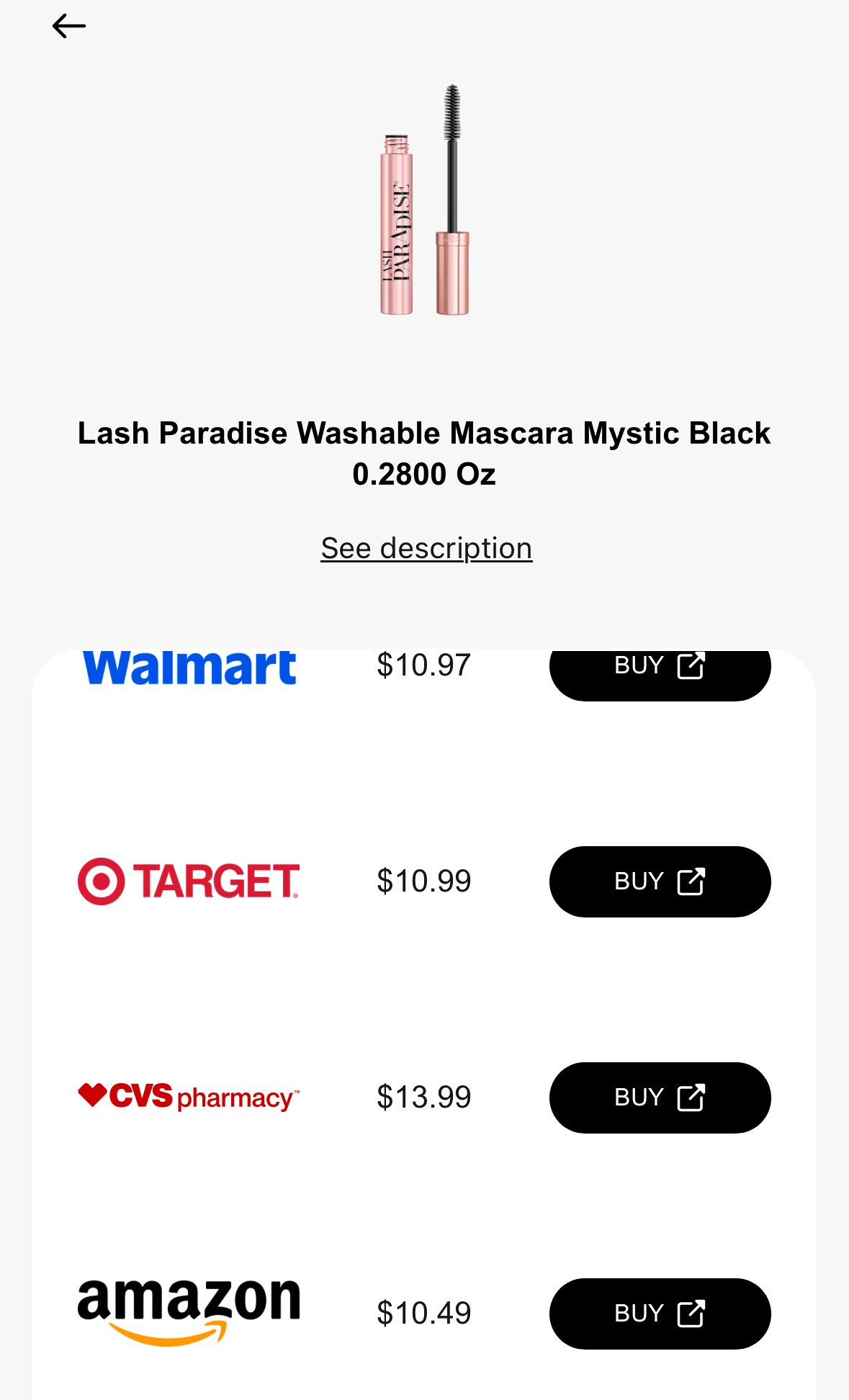 如果您喜歡這些商品,點擊商品旁邊的「BUY ONLINE」按鈕,將會顯示沃爾瑪、Target、亞馬遜以及各大藥妝店等販售該商品的各家廠商的售價,並連結到各商店的商品頁面,讓您可以從您偏好的網路商店順暢地購買。