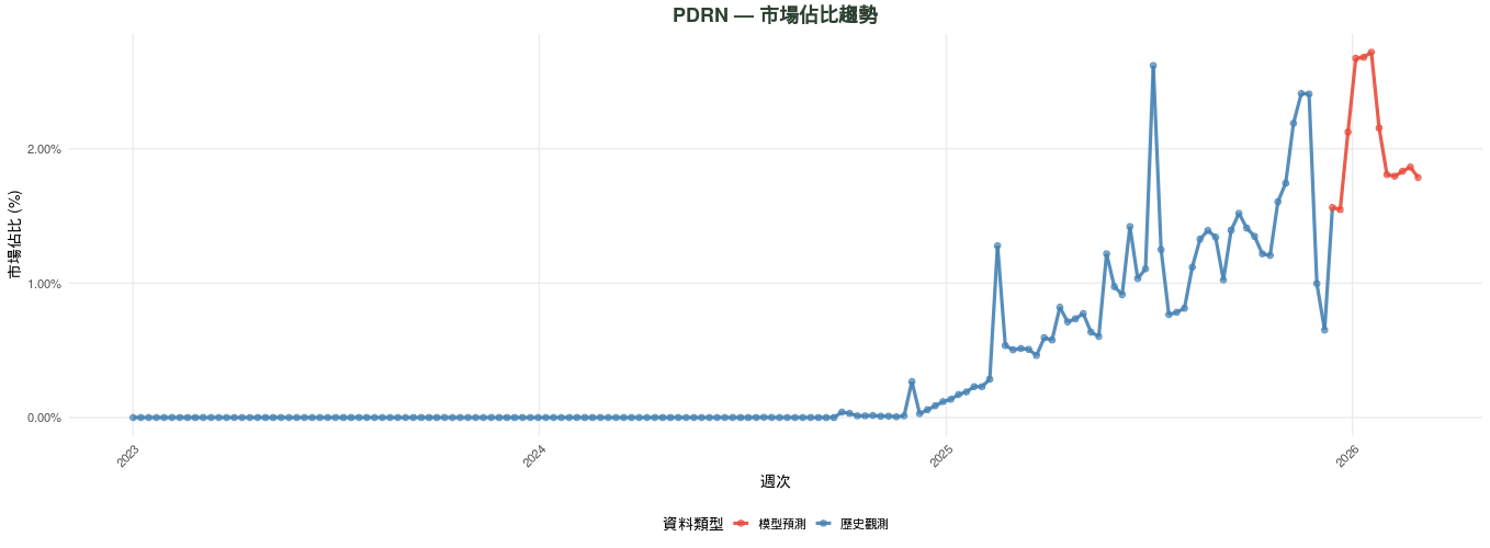 PDRN:雖然基礎佔比仍偏左(相對小),但斜率很高、位置最「往上」,屬於爆發型成分,成長動能強,但還在擴散期(需要教育與情境帶動)。