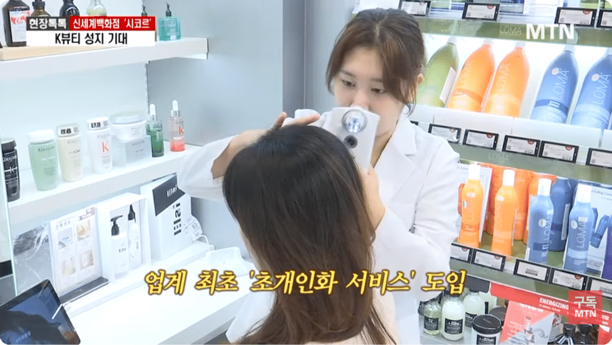 百貨龍頭新世界百貨於 2024 年 6 月在 CHICOR 江南驛店開設了提供體驗型美妝服務的空間。店內的髮絲與身體護理區使用 AI 儀器檢測頭皮狀態,並根據結果現場調配個人專屬的洗髮精或護髮精華,產品可於 2 至 3 天後在店內取貨或配送,這項「訂製洗髮精精華製作服務」是其代表性措施。此外,賣場常駐的彩妝師會根據顧客的膚色與困擾提供妝容建議,並推薦相關產品的「1:1 彩妝吧」,其提供的「偶像仿妝體驗」等實演型接客服務也深受歡迎。
